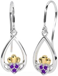 Amethyst Gold Silver Claddagh Dangle Earrings