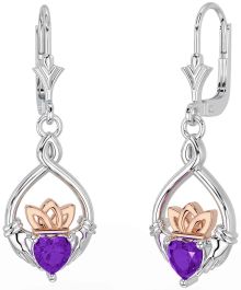 Amethyst Rose Gold Silver Celtic Claddagh Dangle Earrings