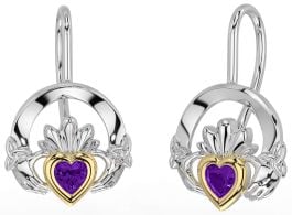 Amethyst White Yellow Gold Claddagh Celtic Trinity Knot Dangle Earrings