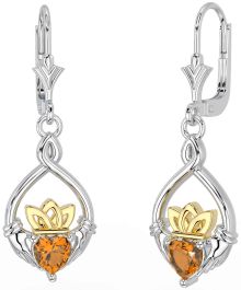 Citrine Gold Silver Celtic Claddagh Dangle Earrings