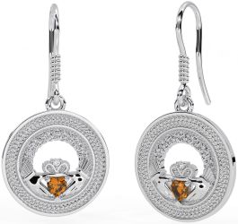 Citrine White Gold Celtic Claddagh Trinity Knot Dangle Earrings
