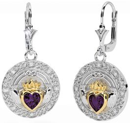 Diamond Alexandrite Gold Silver Celtic Claddagh Dangle Earrings