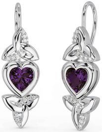 Diamond Alexandrite Silver Celtic Trinity Knot Heart Dangle Earrings