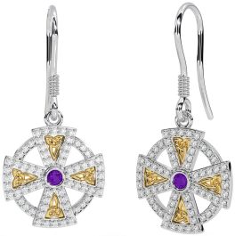 Diamond Amethyst Gold Silver Celtic Cross Dangle Earrings