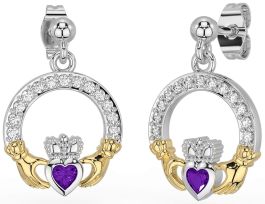 Diamond Amethyst Gold Silver Claddagh Dangle Earrings