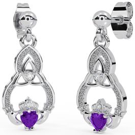 Diamond Amethyst Silver Claddagh Celtic Trinity Knot Dangle Earrings