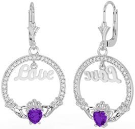 Diamond Amethyst Silver Claddagh Love Dangle Earrings