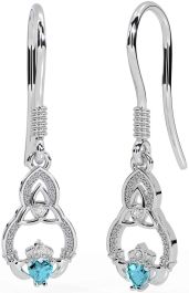 Diamond Aquamarine Silver Claddagh Celtic Trinity Knot Dangle Earrings