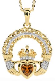Diamond Citrine Gold Claddagh Celtic Trinity Knot Necklace