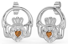 Diamond Citrine White Gold Claddagh Dangle Earrings
