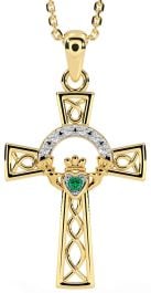 Diamond Emerald Gold Claddagh Celtic Cross Necklace