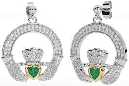 Diamond Emerald Gold Silver Claddagh Dangle Earrings
