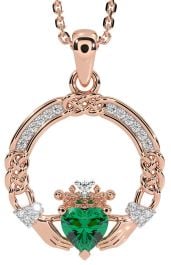 Diamond Emerald Rose Gold Celtic Claddagh Necklace