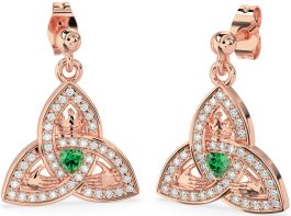 Diamond Emerald Rose Gold Claddagh Trinity Knot Dangle Earrings