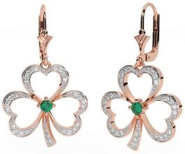 Diamond Emerald Rose Gold Shamrock Dangle Earrings