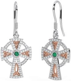 Diamond Emerald Rose Gold Silver Celtic Cross Dangle Earrings