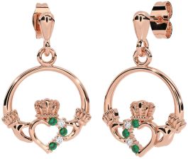 Diamond Emerald Rose Gold Silver Claddagh Dangle Earrings