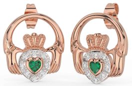 Diamond Emerald Rose Gold Silver Claddagh Dangle Earrings
