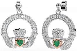 Diamond Emerald Rose Gold Silver Claddagh Dangle Earrings