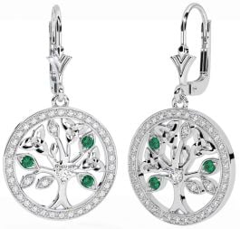 Diamond Emerald Silver Celtic Tree of Life Trinity Knot Dangle Earrings