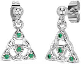 Diamond Emerald Silver Celtic Trinity Knot Dangle Earrings