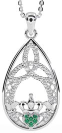 Diamond Emerald Silver Claddagh Celtic Trinity Knot Necklace