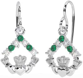 Diamond Emerald Silver Claddagh Dangle Earrings