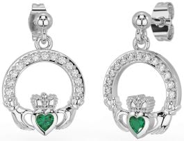 Diamond Emerald Silver Claddagh Dangle Earrings