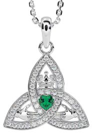 Diamond Emerald Silver Claddagh Trinity knot Necklace