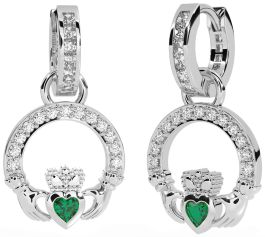 Diamond Emerald White Gold Claddagh Dangle Earrings