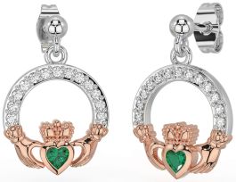 Diamond Emerald White Rose Gold Claddagh Dangle Earrings
