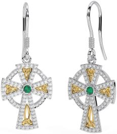 Diamond Emerald White Yellow Gold Celtic Cross Dangle Earrings