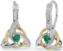 Diamond Emerald White Yellow Gold Celtic Trinity Knot Dangle Earrings