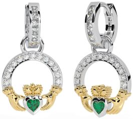 Diamond Emerald White Yellow Gold Claddagh Dangle Earrings