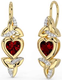 Diamond Garnet Gold Celtic Trinity Knot Heart Dangle Earrings