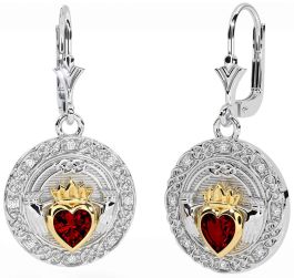 Diamond Garnet Gold Silver Celtic Claddagh Dangle Earrings
