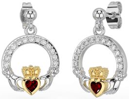 Diamond Garnet Gold Silver Claddagh Dangle Earrings