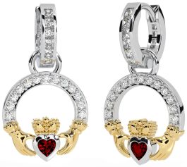 Diamond Garnet Gold Silver Claddagh Dangle Earrings