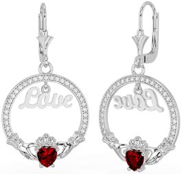 Diamond Garnet Silver Claddagh Love Dangle Earrings