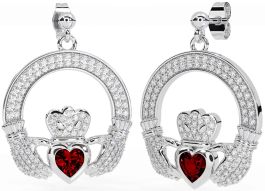 Diamond Garnet White Gold Claddagh Dangle Earrings