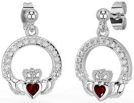 Diamond Garnet White Gold Claddagh Dangle Earrings
