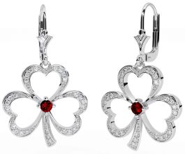 Diamond Garnet White Gold Shamrock Dangle Earrings
