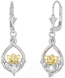 Diamond Gold Silver Celtic Claddagh Dangle Earrings