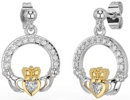 Diamond Gold Silver Claddagh Dangle Earrings