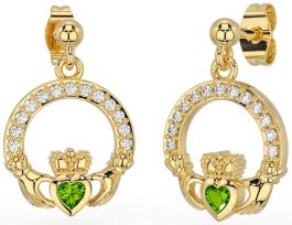 Diamond Peridot Gold Silver Claddagh Dangle Earrings