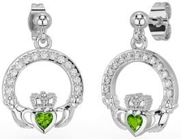 Diamond Peridot Silver Claddagh Dangle Earrings
