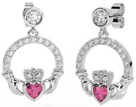 Diamond Pink Tourmaline Silver Claddagh Dangle Earrings