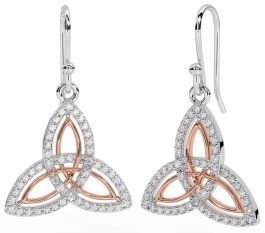 Diamond Rose Gold Silver Celtic Trinity Knot Dangle Earrings