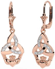 Diamond Rose Gold Silver Claddagh Celtic Trinity Knot Dangle Earrings