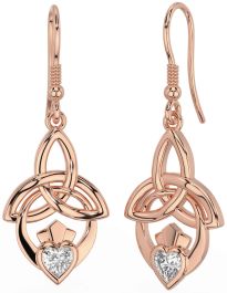 Diamond Rose Gold Silver Claddagh Celtic Trinity Knot Dangle Earrings